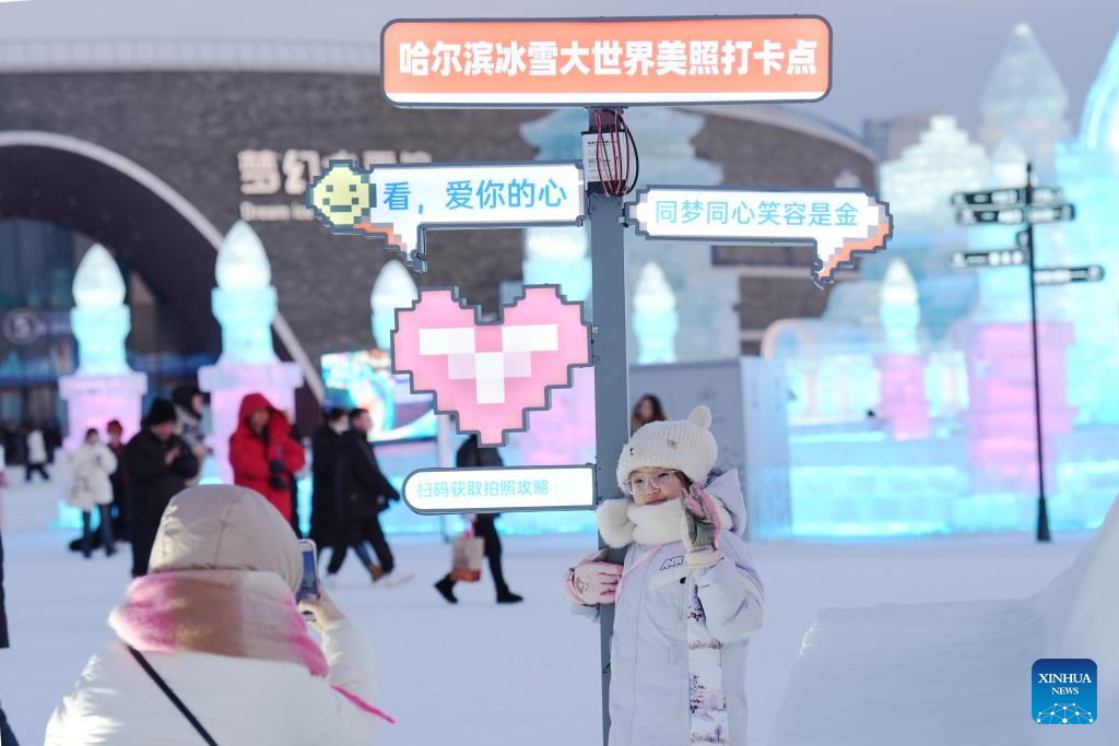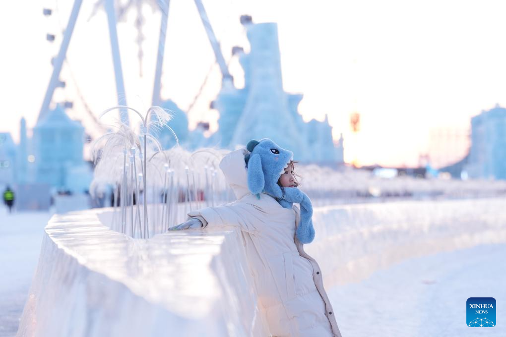 A girl poses for photos at the Harbin Ice-Snow World in Harbin, northeast China's Heilongjiang Province, Feb. 25, 2025. The 26th Harbin Ice-Snow World officially closed on Wednesday as temperatures rise. (Xinhua/Wang Song)
