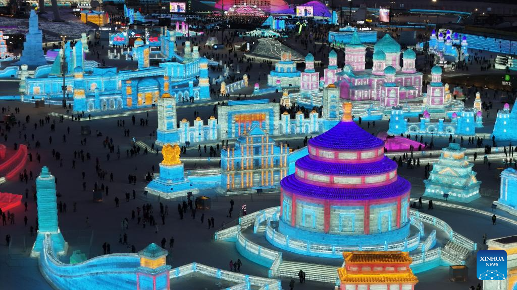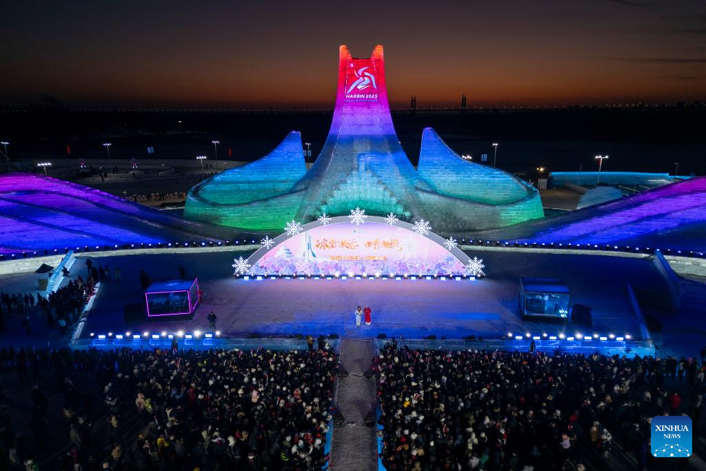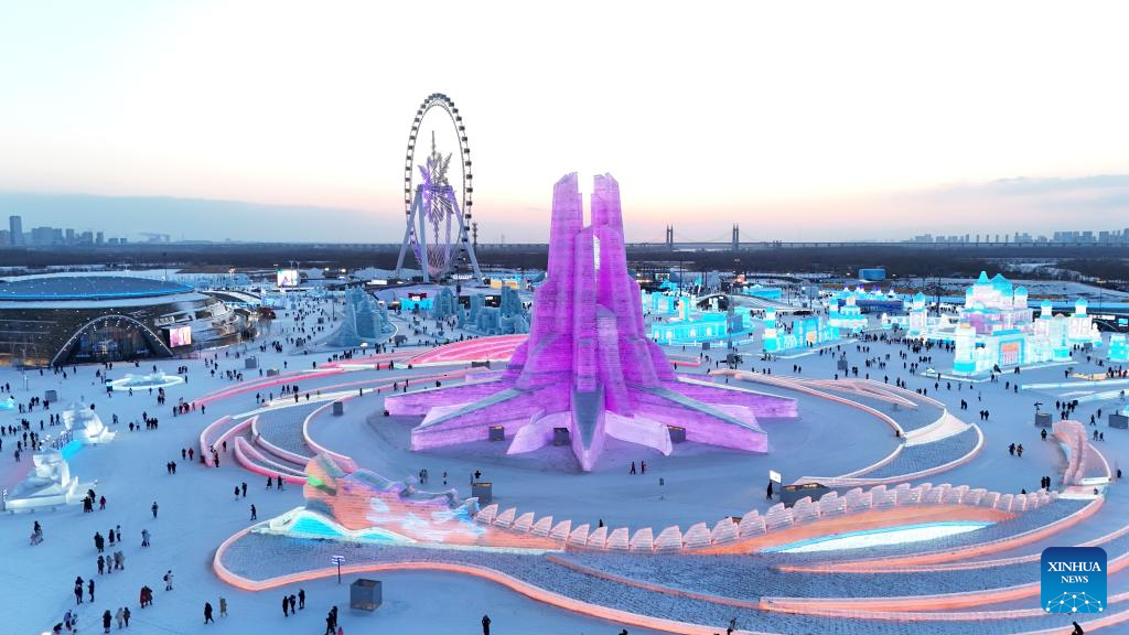 An aerial drone photo shows tourists watching performances at the Harbin Ice-Snow World in Harbin, northeast China's Heilongjiang Province, Feb. 26, 2025. Harbin Ice-Snow World, the world's largest ice-and-snow theme park, officially closed its 26th edition on Wednesday evening in the city of Harbin, capital of China's northernmost Heilongjiang Province, attracting a record-breaking 3.56 million tourist visits, said the park's operator. (Xinhua/Zhang Tao)