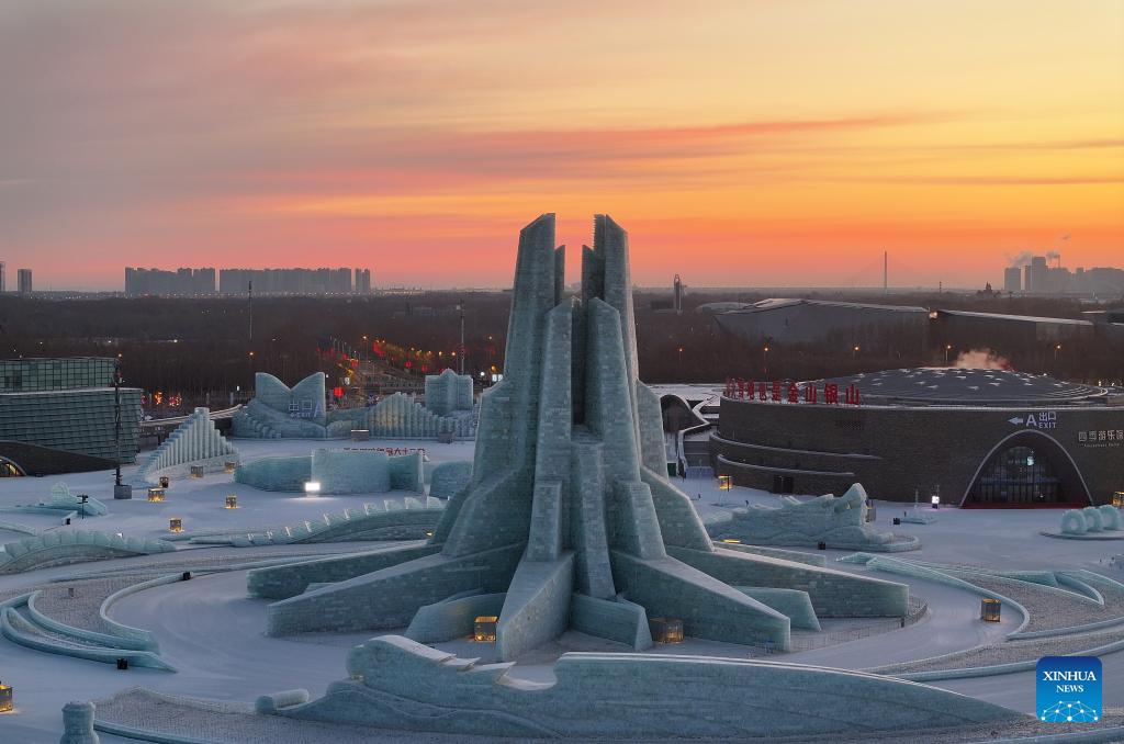 An aerial drone photo taken on Feb. 25, 2025 shows a view of the Harbin Ice-Snow World in Harbin, northeast China's Heilongjiang Province. The 26th Harbin Ice-Snow World officially closed on Wednesday as temperatures rise. (Xinhua/Wang Song)