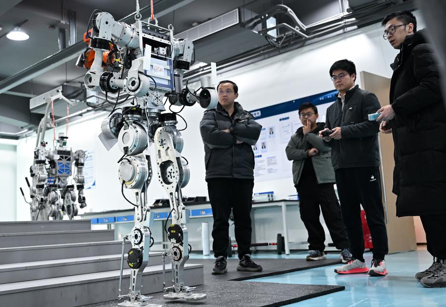 Members of the R&D team of Wuhan Glory Road Intelligent Technology Co., Ltd., debug the humanoid robot at the company in Wuhan, central China's Hubei Province, Feb. 24, 2025. (Xinhua/Du Zixuan)