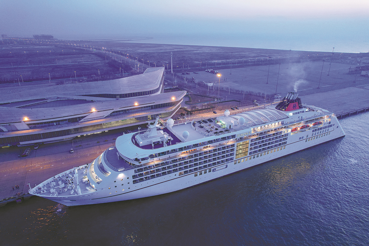 The Europa 2 berths at Tianjin International Cruise Home Port early on Tuesday. The cruise ship, which follows a global route, will stay in Tianjin for two days and one night, during which passengers and crew members will tour the city, as well as Beijing. (Tong Yu/China News Service)