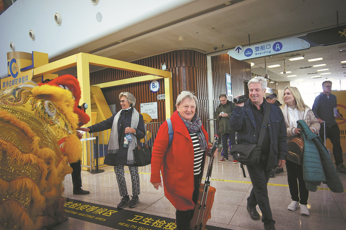 A lion dance performance greets foreign tourists upon their arrival in Tianjin onboard the Europa 2 on Tuesday. The cruise ship, carrying more than 460 visitors from 15 countries and regions, including Germany, Australia and Austria, is the first such passenger vessel to drop anchor in Tianjin this year. (Tong Yu/China News Service)