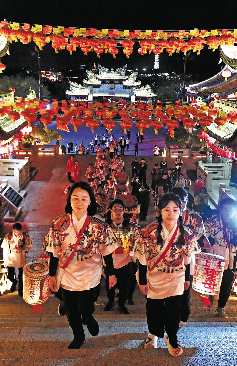Some 120 young people from the Chinese mainland and Taiwan arrive at the Meizhou Mazu Temple on Meizhou Island, Fujian province, on Nov 24, to worship and pay tribute to the sea goddess. Clad in hanfu, they had walked more than 200 kilometers in five days and four nights on their pilgrimage. (Lyu Ming/China News Service)