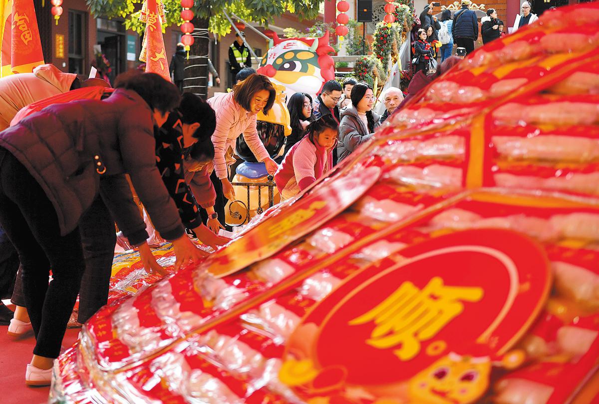 People touch a tortoise made with some 29.4 metric tons of rice for good wishes at a Mazu temple in Quanzhou, Fujian province, on Feb 10, Lantern Festival. Co-organized by Mazu temples in Quanzhou and Taiwan's Penghu, the Qigui ritual — touching a rice tortoise from head to tail — is held on Lantern Festival to pray for peace and happiness. (Lyu Ming/China News Service)