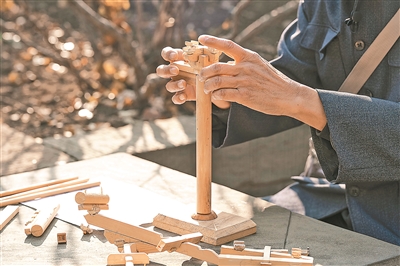 Wang Yongxian assembles a dougong model. (Photo/Lu Pengyu)