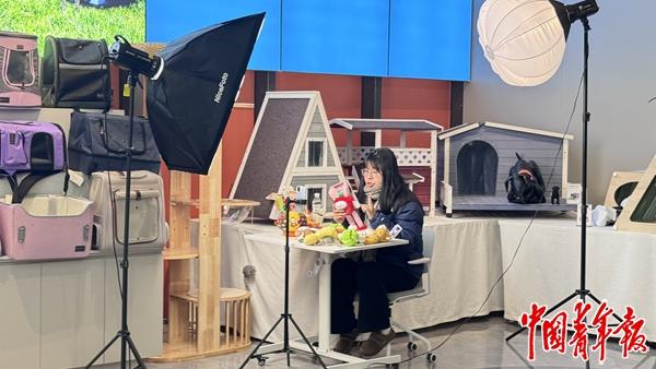 A live streamer promotes pet products via livestreaming at the livestreaming base of Pingyang pet town, a multifunctional base of pet supplies industry and pet tourism in Shuitou township, Pingyang county, Wenzhou city, east China's Zhejiang Province, Jan. 9, 2025. (China Youth Daily/Zhao Limei)