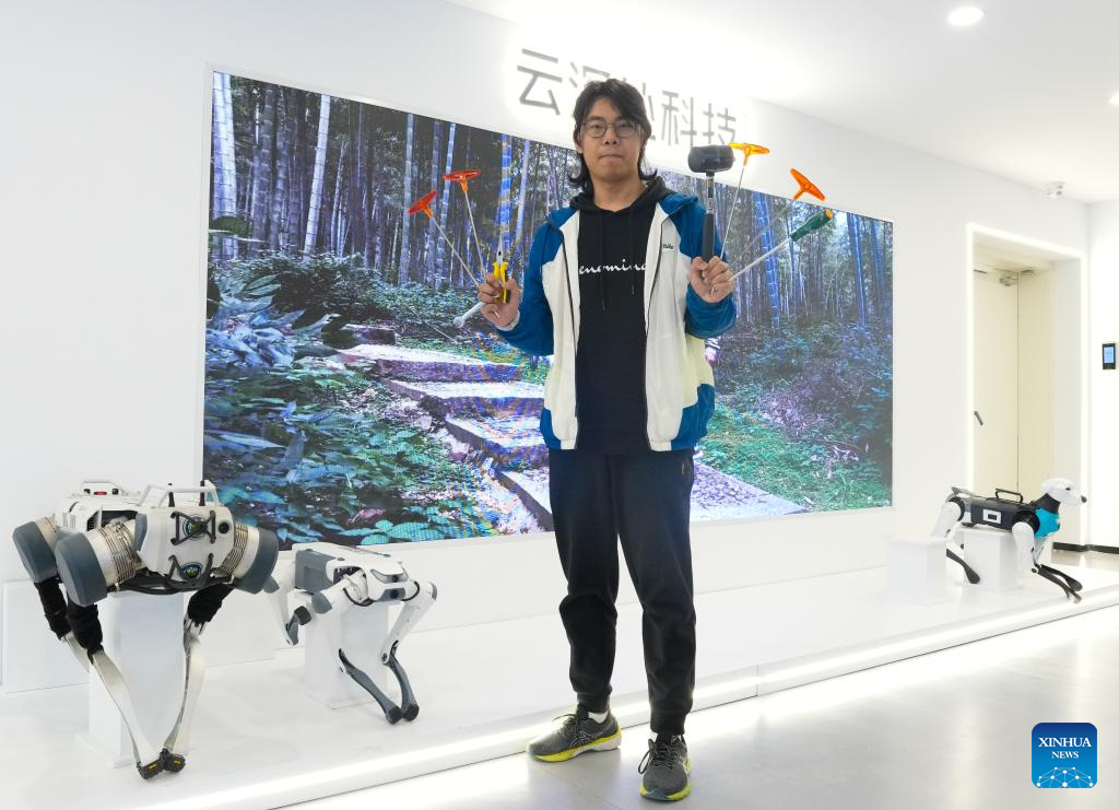 Yang Jun poses for a photo at DEEP Robotics in Hangzhou, east China's Zhejiang Province, Feb. 28, 2025. Yang Jun, born in 2003, is an engineer on the technical support team at Hangzhou-based robotics firm DEEP Robotics. An enthusiast of anime and mech models, he majored in computer science and technology in college and logged in his dreamed walk of life after graduation.