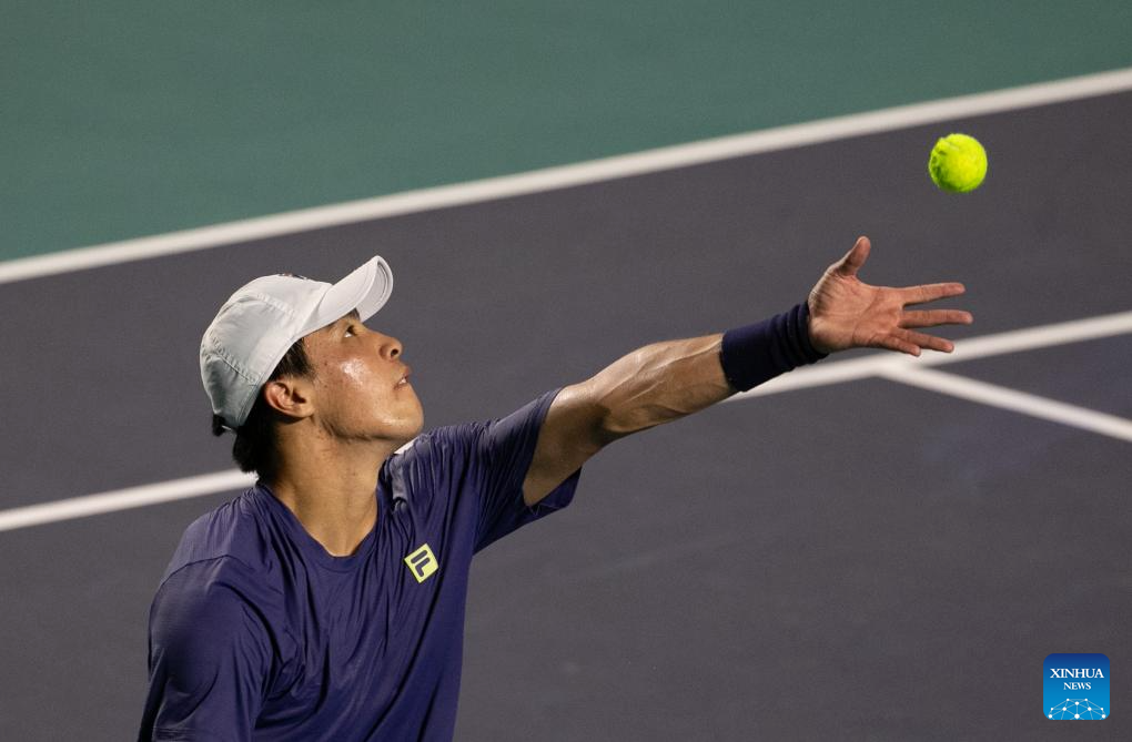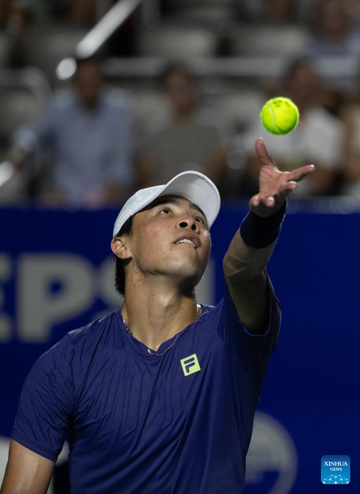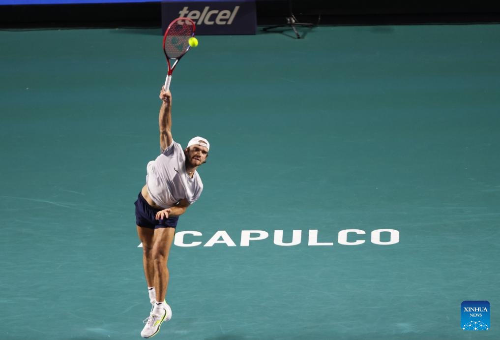 Nakashima Brandon of the United States serves during the singles semifinal match against Tomas Machac of the Czech Republic at the 2025 ATP Mexican Open tennis tournament in Acapulco, Mexico, Feb. 28, 2025. (Xinhua/Li Mengxin)