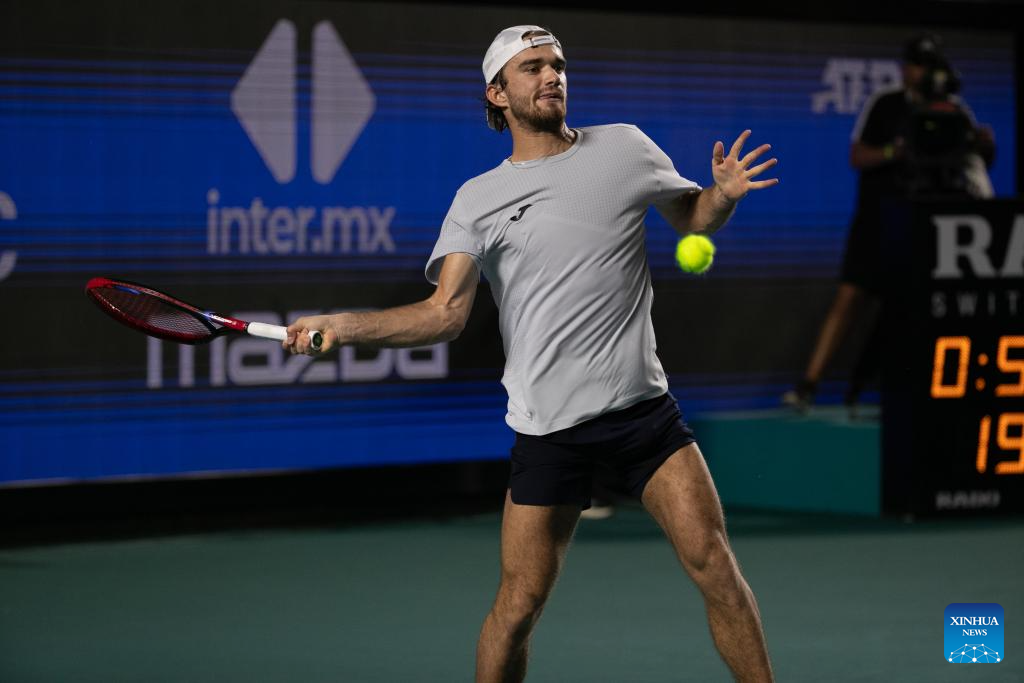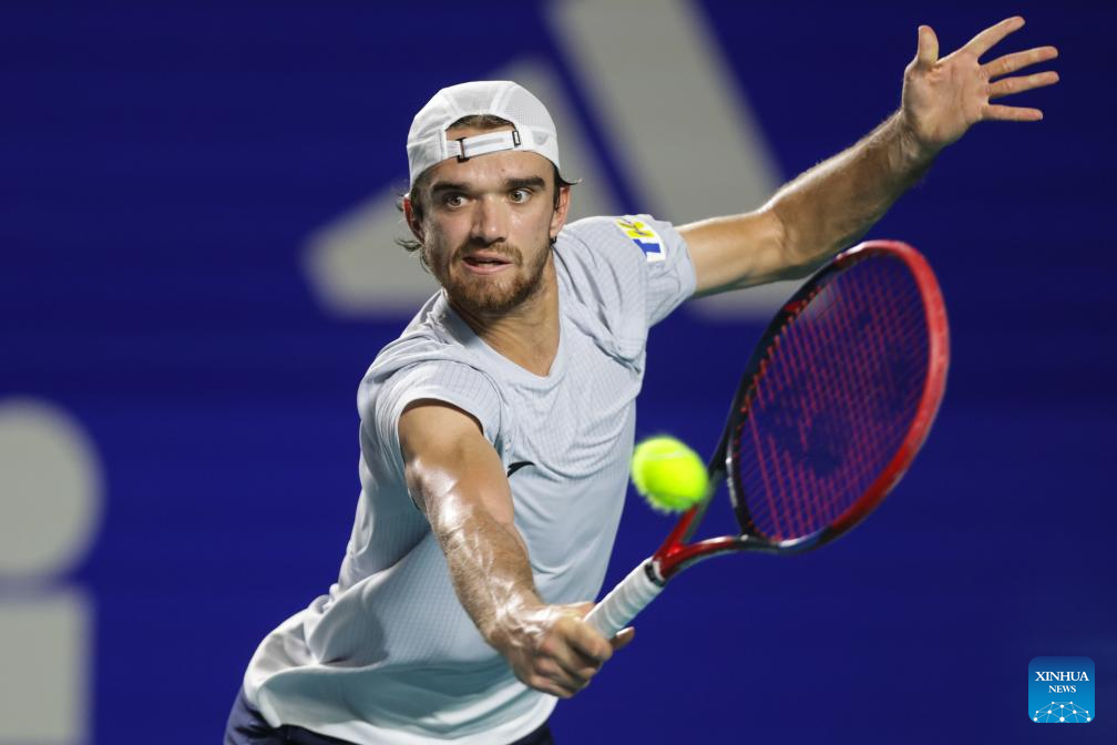 Tomas Machac of the Czech Republic hits a return during the singles semifinal match against Nakashima Brandon of the United States at the 2025 ATP Mexican Open tennis tournament in Acapulco, Mexico, Feb. 28, 2025. (Xinhua/Li Mengxin)