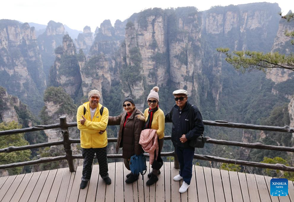 Tourists from South Korea pose for a photo at Zhangjiajie National Forest Park in central China's Hunan Province, Feb. 15, 2025.