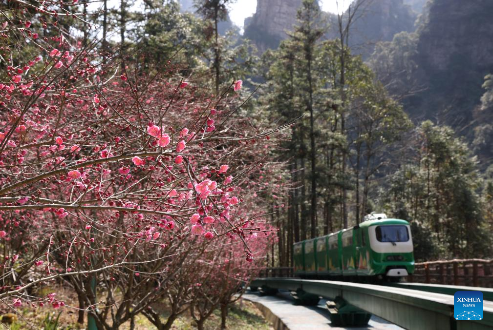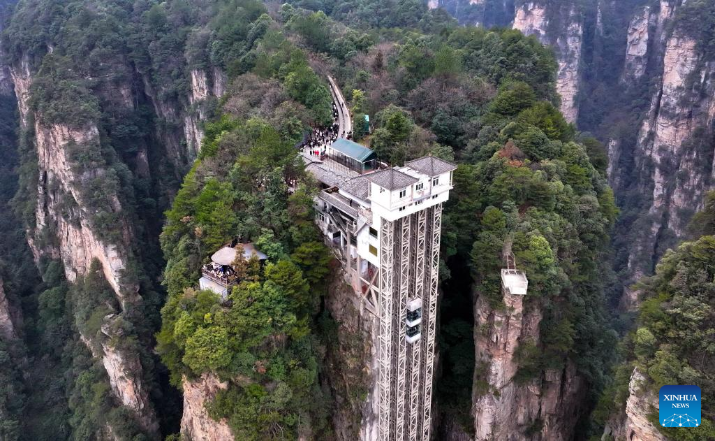 Tourists take a sightseeing tram at Zhangjiajie National Forest Park in central China's Hunan Province, Feb. 15, 2025.