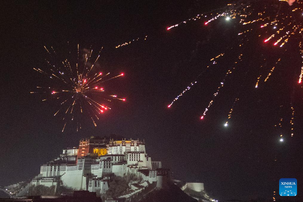 An aerial drone photo taken on Feb. 27, 2025 shows fireworks illuminating the sky on the "Gutu Eve" in Lhasa, southwest China's Xizang Autonomous Region. On the traditional "Gutu Eve", families gathered together to have a feast of "gutu", a traditional soup dish made of flour. Fireworks and sparklers popped, glittered, and lit up the sky over Lhasa in celebration of the Tibetan new year. (Xinhua/Jiang Fan)