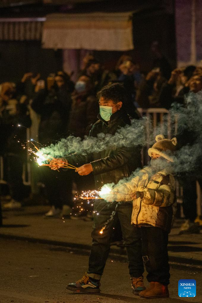 People play fireworks in celebration of the "Gutu Eve" in Lhasa, southwest China's Xizang Autonomous Region, Feb. 27, 2025. On the traditional "Gutu Eve", families gathered together to have a feast of "gutu", a traditional soup dish made of flour. Fireworks and sparklers popped, glittered, and lit up the sky over Lhasa in celebration of the Tibetan new year. (Xinhua/Jiang Fan)