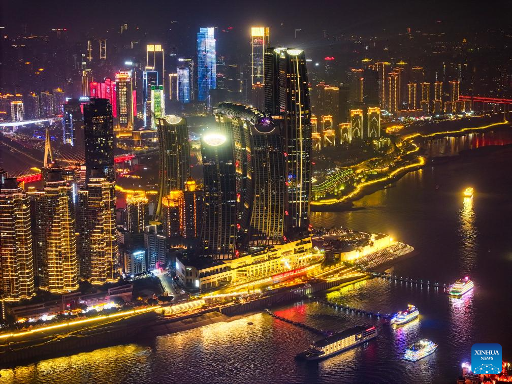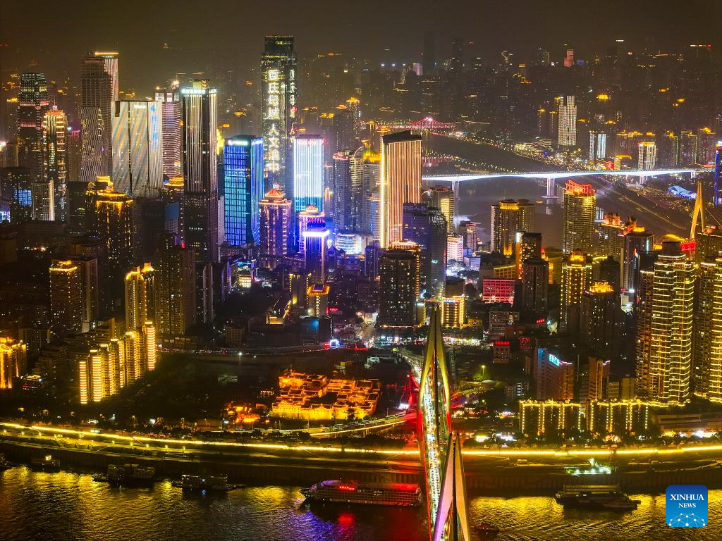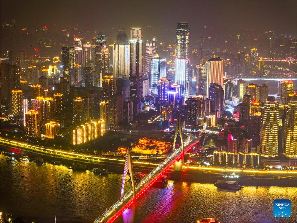 An aerial drone photo shows a night view of the downtown area of Chongqing, southwest China, Feb. 28, 2025. (Xinhua/Wang Quanchao)