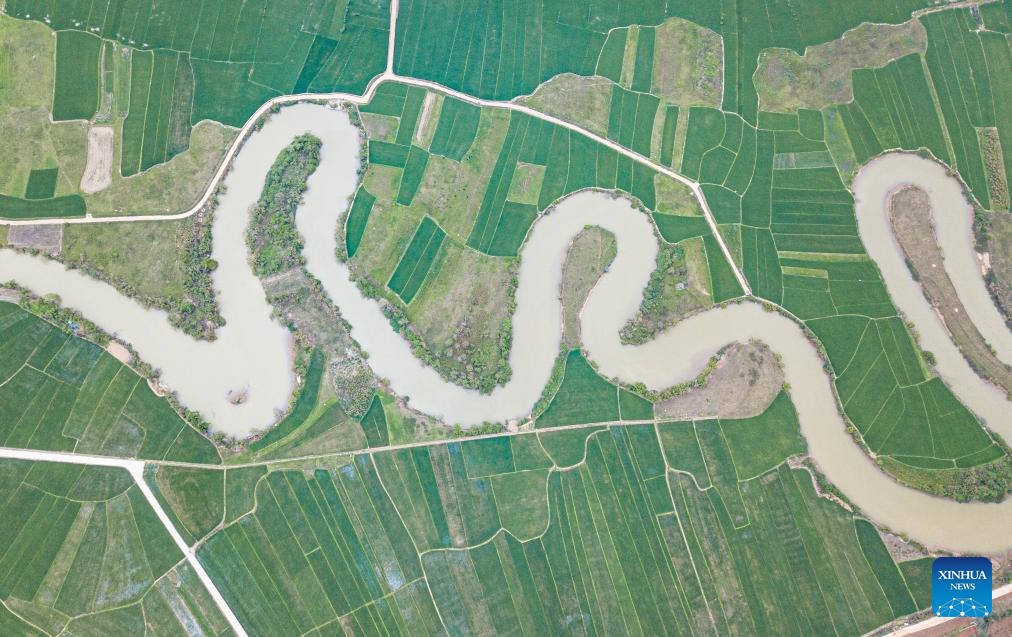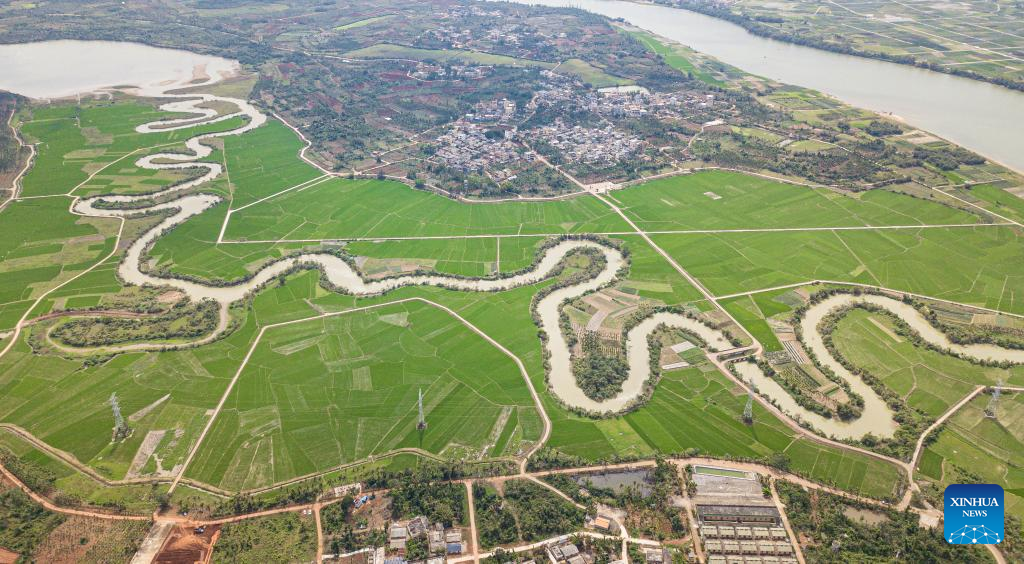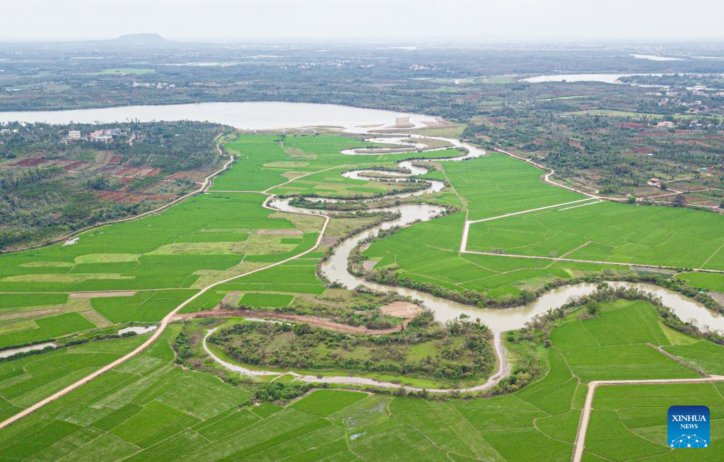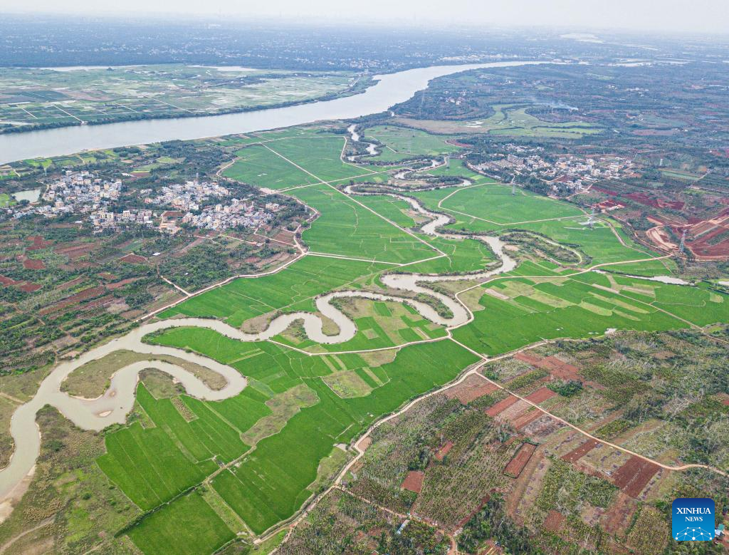 An aerial drone photo taken on March 1, 2025 shows a tributary of the Nandu River meandering through a paddy field in Qiongshan District of Haikou, south China's Hainan Province. (Xinhua/Pu Xiaoxu)