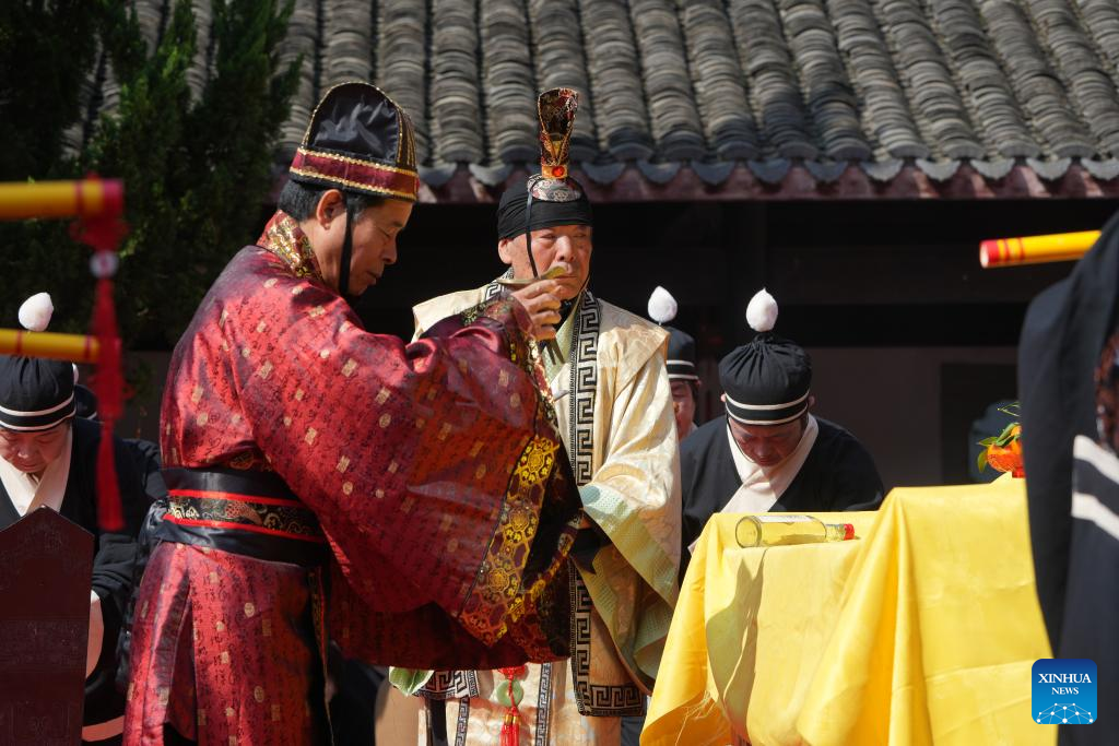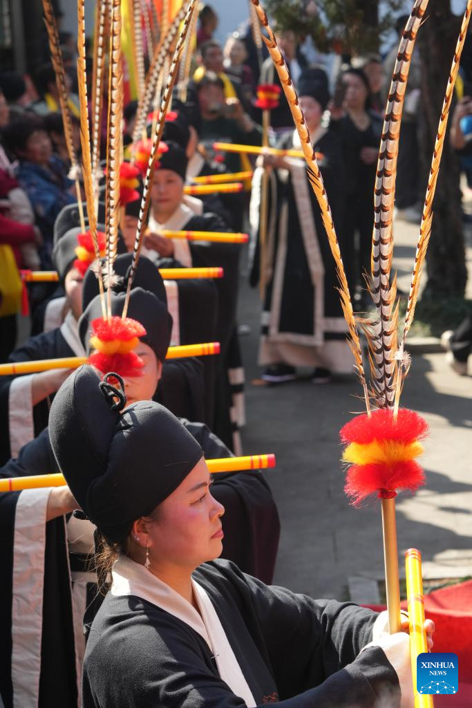 People attend a rite at the Mencius Temple in Yingdianjie Town of Zhuji, east China's Zhejiang Province, March 1, 2025. The rite, attended by descendants of Mencius and people from all walks of life, was held here on Saturday to celebrate Mencius' birthday. (Xinhua/Weng Xinyang)