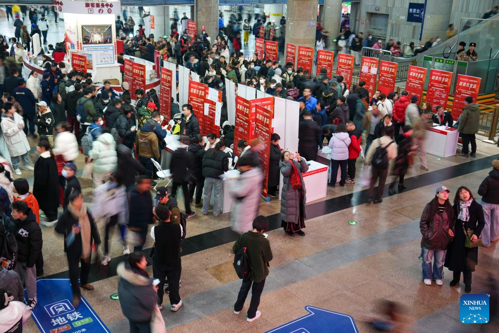 This photo taken on Feb. 28, 2025 shows a job fair held at the Beijing West Railway Station in Beijing, capital of China. The job fair kicked off on Friday at the railway station to facilitate job hunting efforts of migrant workers who have just arrived in the city. Nearly 100 employers offered more than 3,000 openings at the fair. (Xinhua/Ju Huanzong)