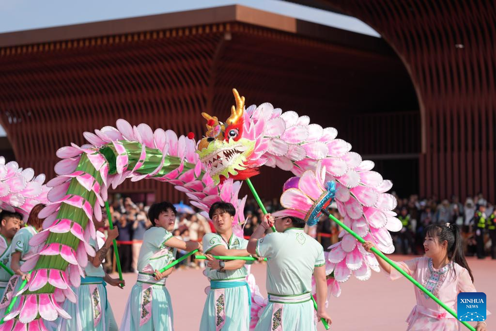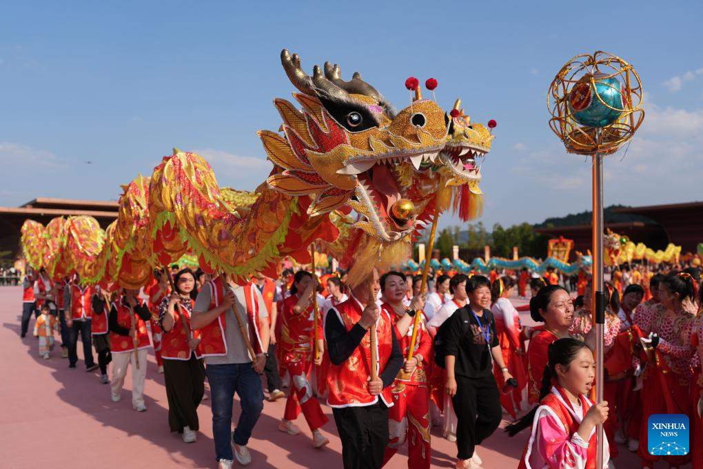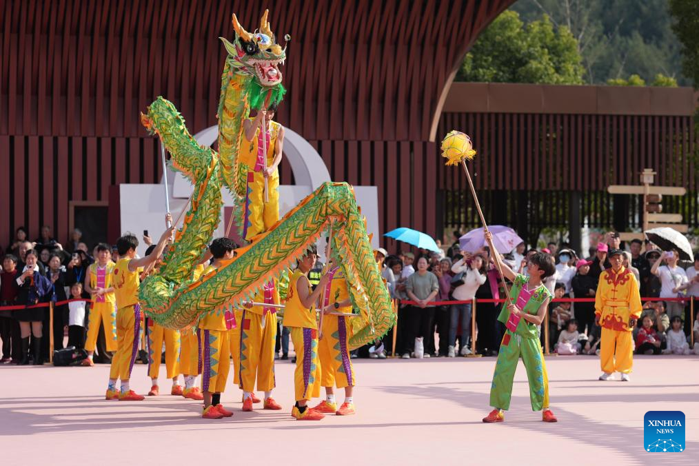 People perform Fenghua Cloth Dragon Dance during cultural event in China's Zhejiang