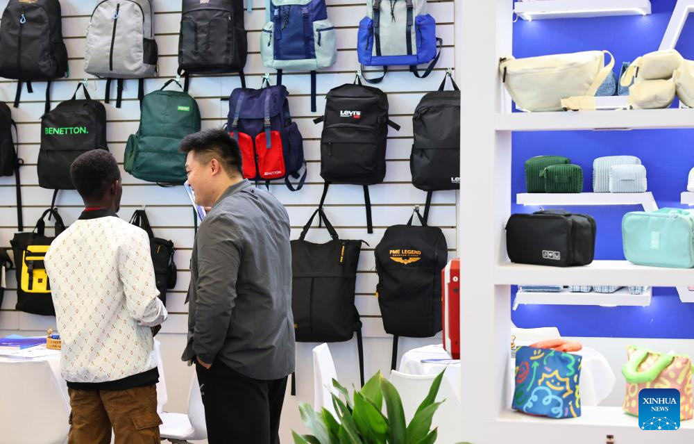 An exhibitor (R) introduces his products to an overseas purchaser during the 33rd East China Fair in Shanghai, east China, March 1, 2025. The 33rd East China Fair kicked off here on Saturday, featuring more than 5,100 booths in six themed sections of garments, textiles, household products, gifts, cross-border e-commerce, and overseas business. (Xinhua/Fang Zhe)