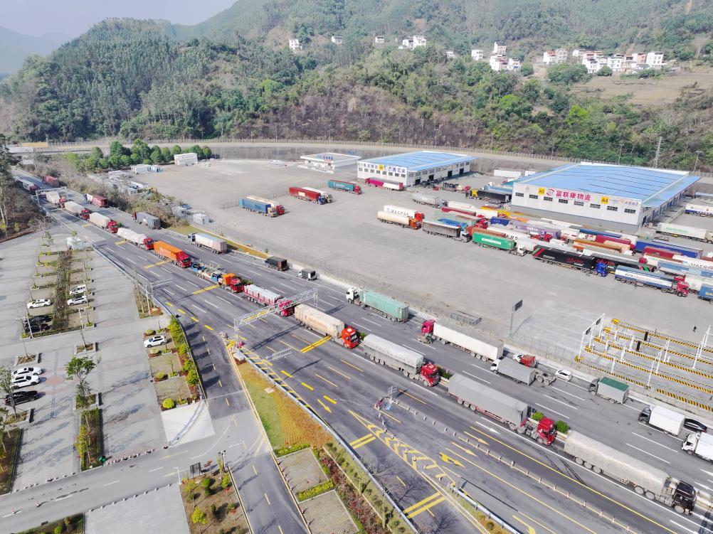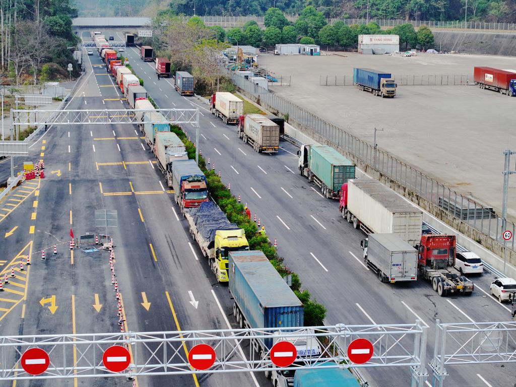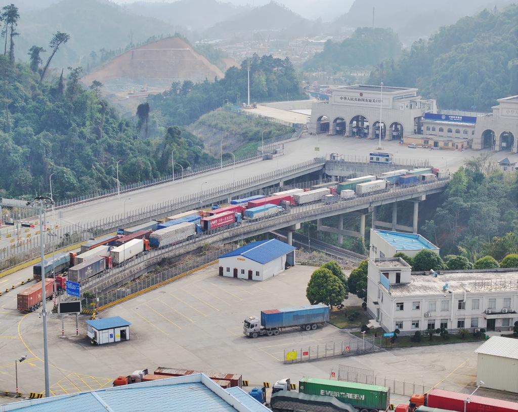 An aerial drone photo shows vehicles waiting to pass through Youyiguan Port, or Friendship Pass, in Pingxiang City, south China's Guangxi Zhuang Autonomous Region, March 1, 2025. With the booming economic and trade cooperation between China and Vietnam, major border ports witness increasing border traffic. (Xinhua/Zhou Hua)
