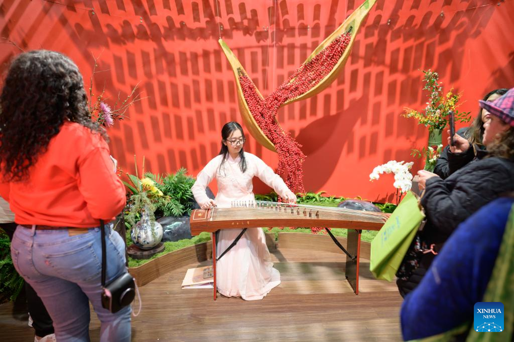 An artist plays guzheng, a traditional Chinese musical instrument, at the Qingdao pavilion of the 196th Philadelphia Flower Show in Philadelphia, the United States, March 1, 2025. Qingdao, a coastal city in east China's Shandong Province, unveiled its charm at the 196th Philadelphia Flower Show on Saturday. (Xinhua)