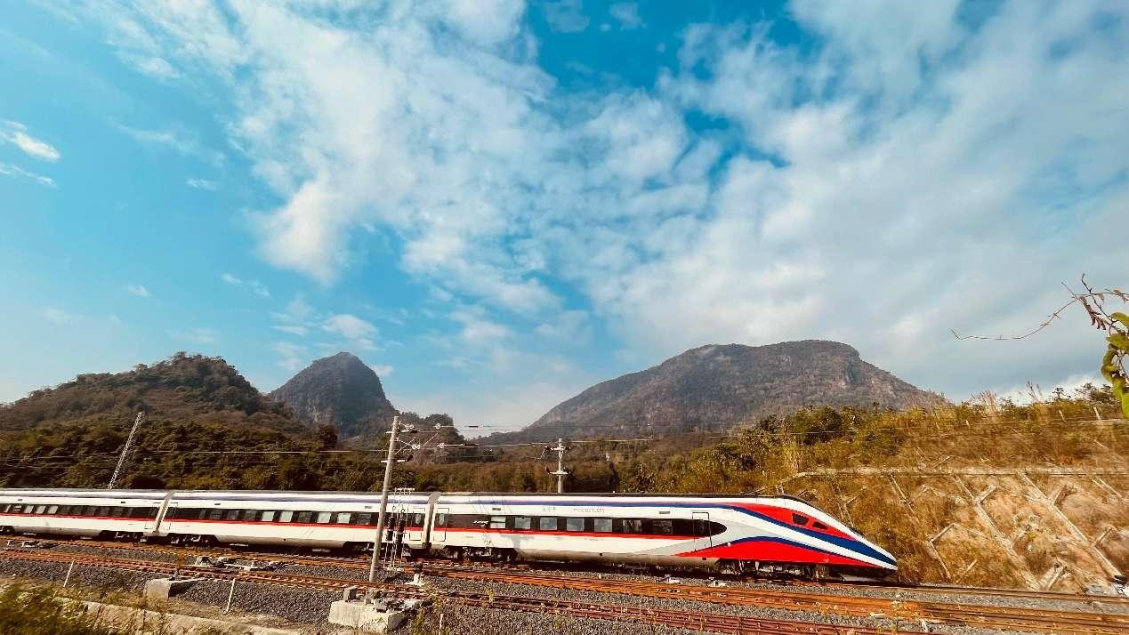 A Lancang bullet train runs on the China-Laos Railway in Luang Prabang, Laos. (People's Daily/Sun Guangyong)