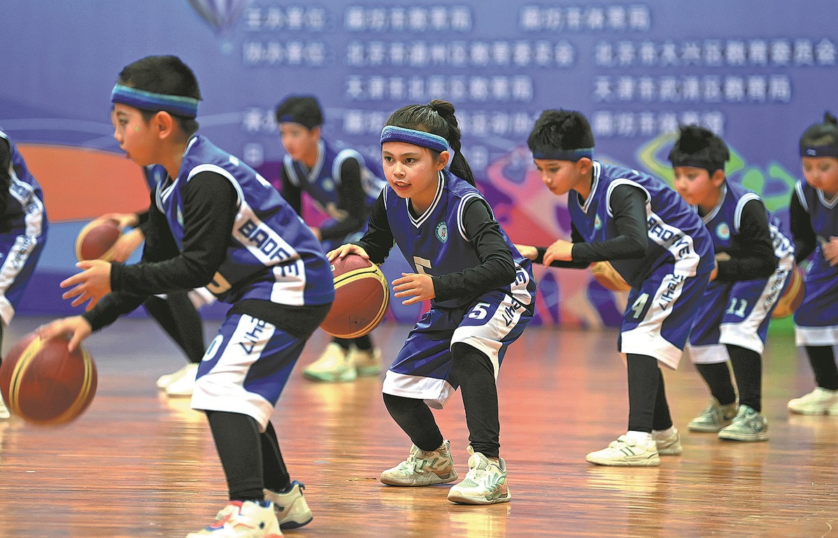 Primary school students take part in a physical education program in Langfang, that highlights scholastic achievements. (Wang Xiao/Xinhua)