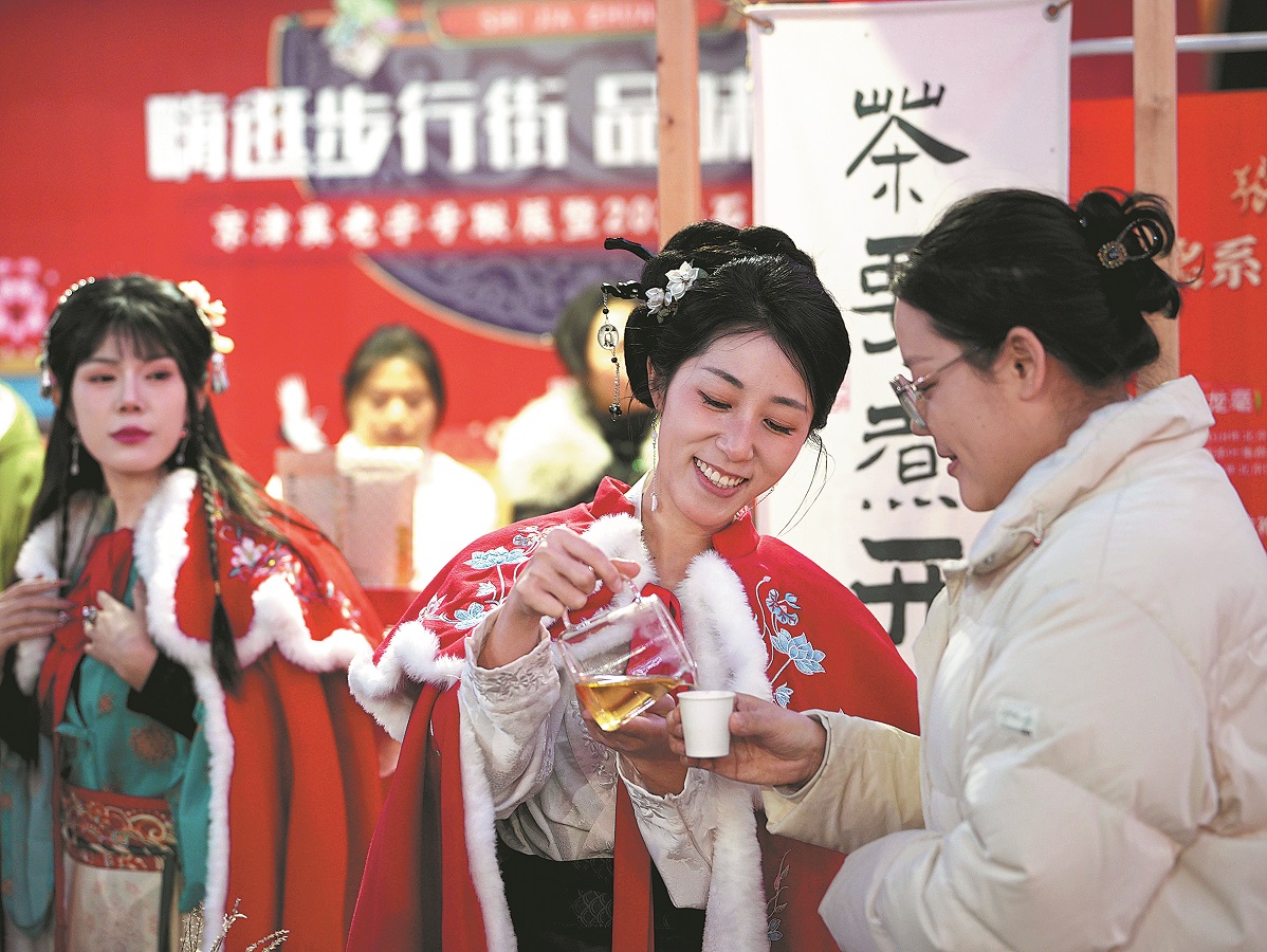 A visitor samples a drink at the Beijing-Tianjin-Hebei time-honored brands exhibition in Shijiazhuang, Hebei, on Nov 30. (Photo/Xinhua)