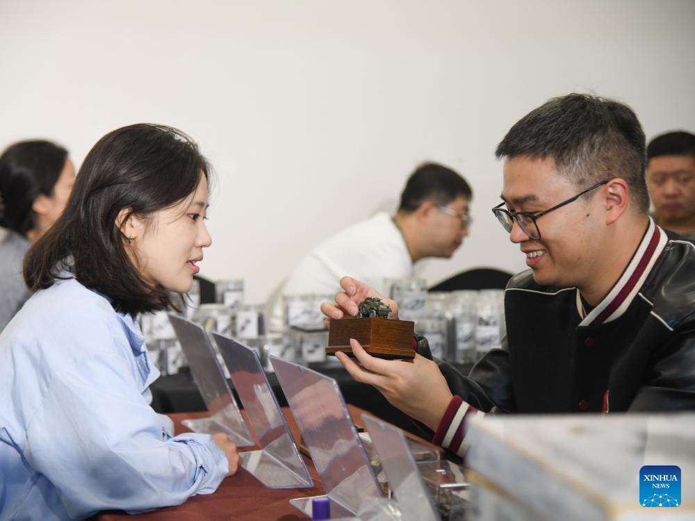 Zeng Zhou (1st R) communicates with a participant during a contest of creative ideas on static models in Chengdu, southwest China's Sichuan Province, Oct. 26, 2024. Zeng Zhou, a cultural creative product designer and planning operator born in the 1990s, has been fascinated with animation and movie peripheral products as well as trendy toys and figurines since his childhood, dreaming of developing cultural creative products that embody the charm of traditional Chinese culture.