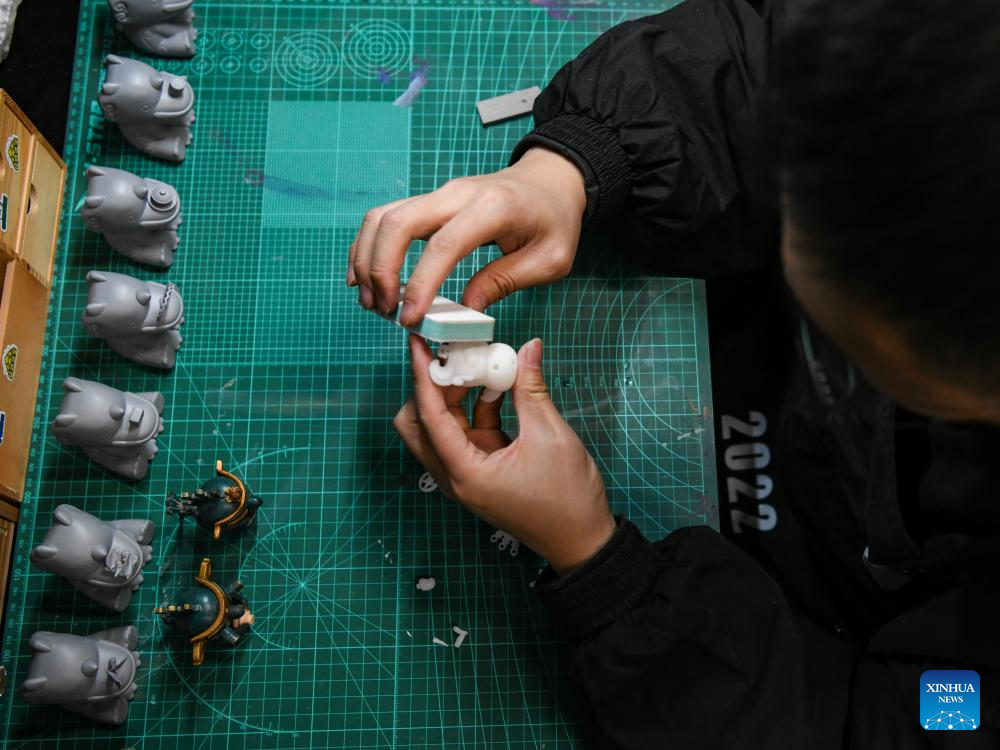 Zeng Zhou works on a model at his studio in Chengdu, southwest China's Sichuan Province, March 1, 2025. Zeng Zhou, a cultural creative product designer and planning operator born in the 1990s, has been fascinated with animation and movie peripheral products as well as trendy toys and figurines since his childhood, dreaming of developing cultural creative products that embody the charm of traditional Chinese culture.