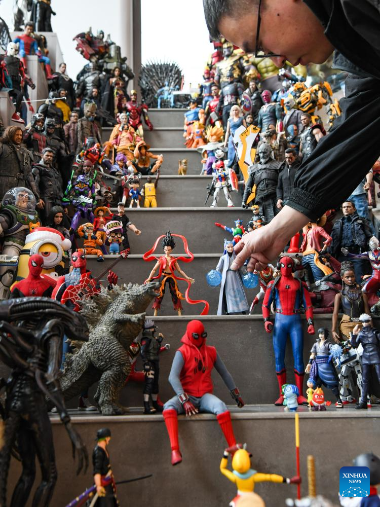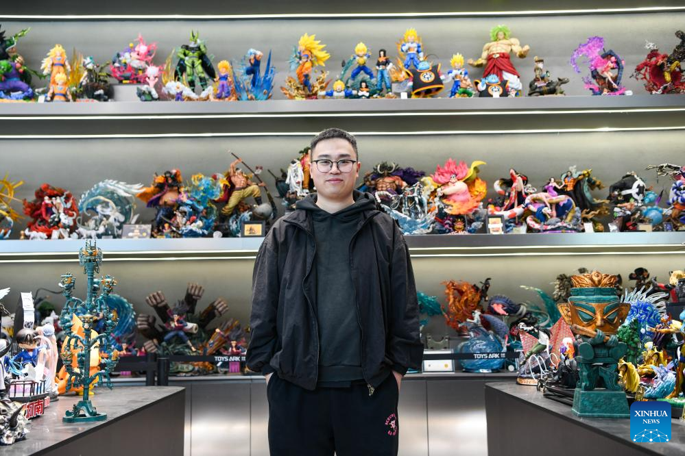 Zeng Zhou arranges toys and figurines he has collected at his shop in Chengdu, southwest China's Sichuan Province, March 1, 2025. Zeng Zhou, a cultural creative product designer and planning operator born in the 1990s, has been fascinated with animation and movie peripheral products as well as trendy toys and figurines since his childhood, dreaming of developing cultural creative products that embody the charm of traditional Chinese culture.