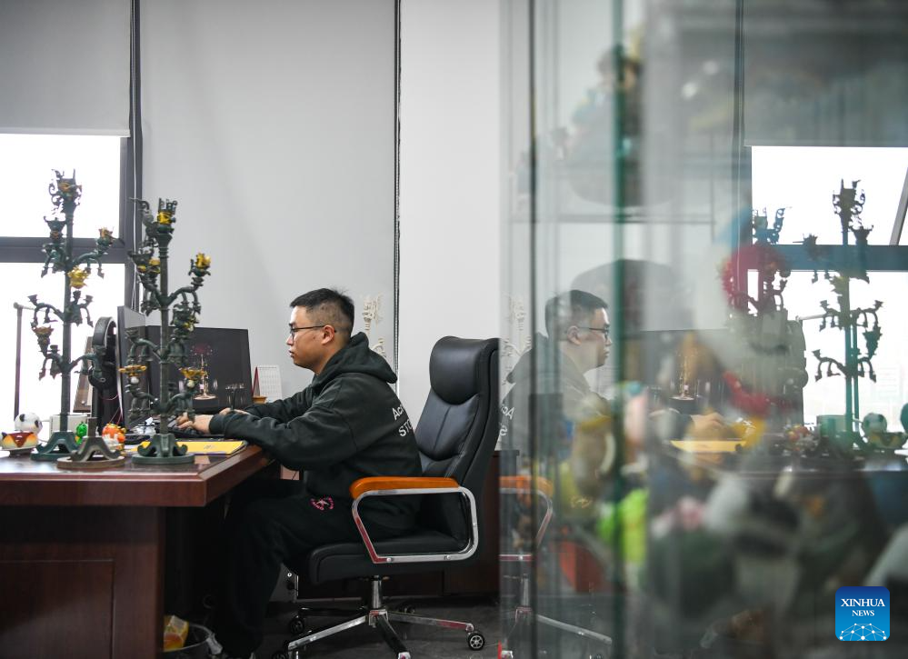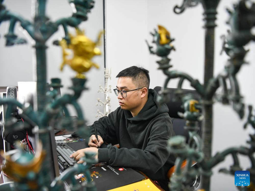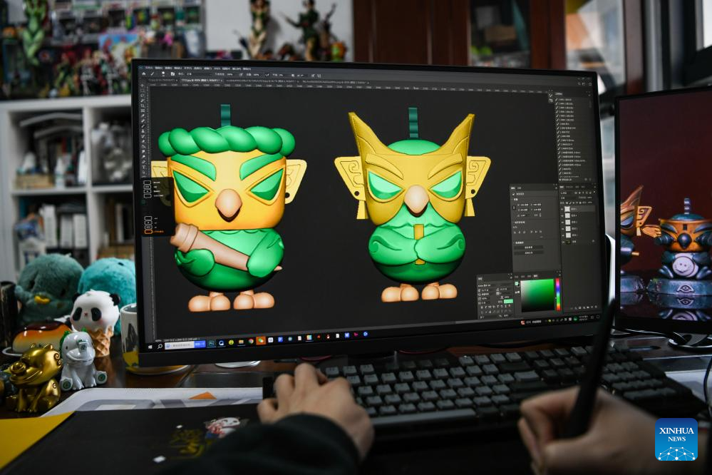Zeng Zhou refines the designing of a cultural creative product inspired by the Sacred Tree displayed at the Sanxingdui Museum, at his office in Chengdu, southwest China's Sichuan Province, March 1, 2025. Zeng Zhou, a cultural creative product designer and planning operator born in the 1990s, has been fascinated with animation and movie peripheral products as well as trendy toys and figurines since his childhood, dreaming of developing cultural creative products that embody the charm of traditional Chinese culture.