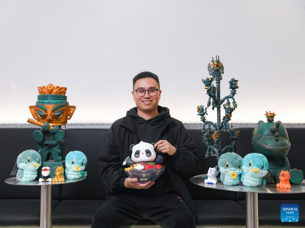 This photo taken on March 1, 2025 shows Zeng Zhou at the Tianfu international center for animation in Chengdu, southwest China's Sichuan Province. Zeng Zhou, a cultural creative product designer and planning operator born in the 1990s, has been fascinated with animation and movie peripheral products as well as trendy toys and figurines since his childhood, dreaming of developing cultural creative products that embody the charm of traditional Chinese culture.