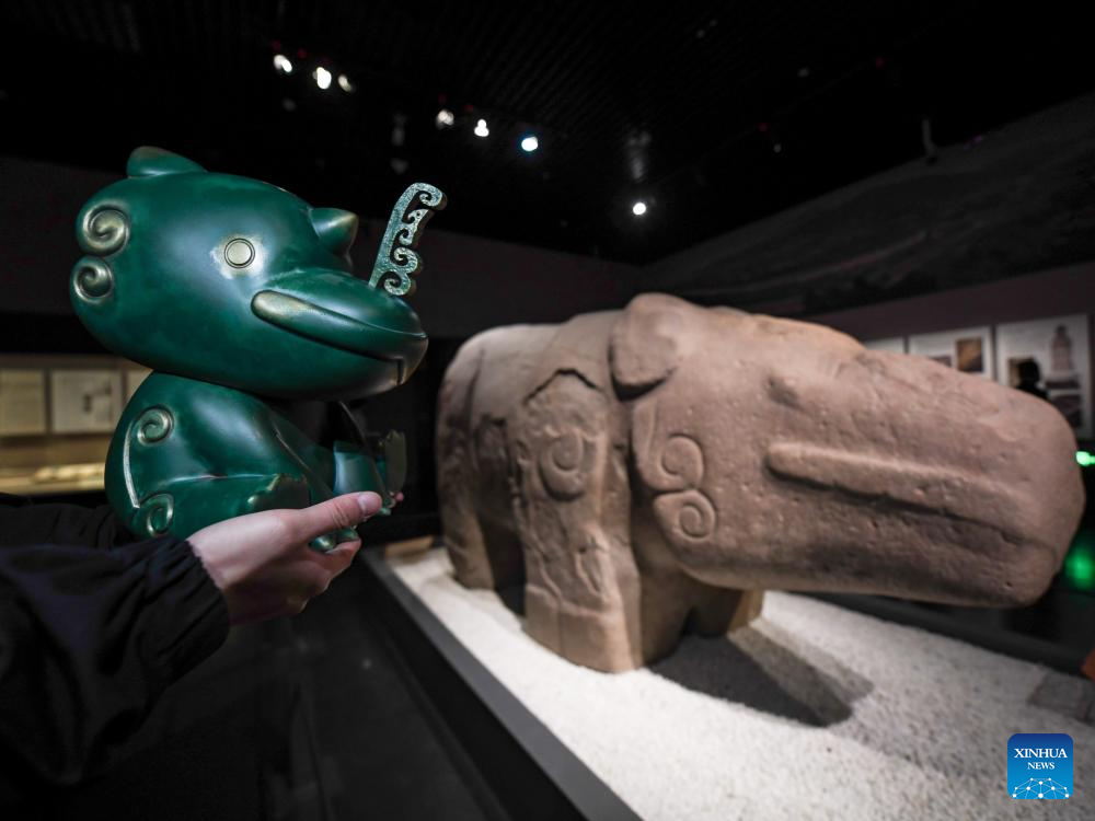 Zeng Zhou films a cultural creative product inspired by the Sacred Tree in the Sanxingdui Museum at his shop in Chengdu, southwest China's Sichuan Province, March 1, 2025. Zeng Zhou, a cultural creative product designer and planning operator born in the 1990s, has been fascinated with animation and movie peripheral products as well as trendy toys and figurines since his childhood, dreaming of developing cultural creative products that embody the charm of traditional Chinese culture.