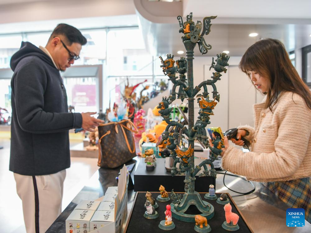 Customers select cultural creative products at Zeng Zhou's shop in Chengdu, southwest China's Sichuan Province, March 1, 2025. Zeng Zhou, a cultural creative product designer and planning operator born in the 1990s, has been fascinated with animation and movie peripheral products as well as trendy toys and figurines since his childhood, dreaming of developing cultural creative products that embody the charm of traditional Chinese culture.