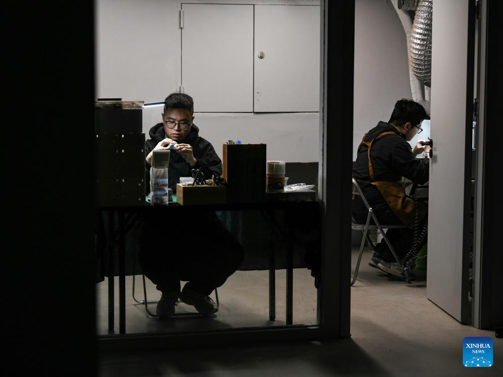 Zeng Zhou (L) works on a model at his stuio in Chengdu, southwest China's Sichuan Province, March 1, 2025. Zeng Zhou, a cultural creative product designer and planning operator born in the 1990s, has been fascinated with animation and movie peripheral products as well as trendy toys and figurines since his childhood, dreaming of developing cultural creative products that embody the charm of traditional Chinese culture.