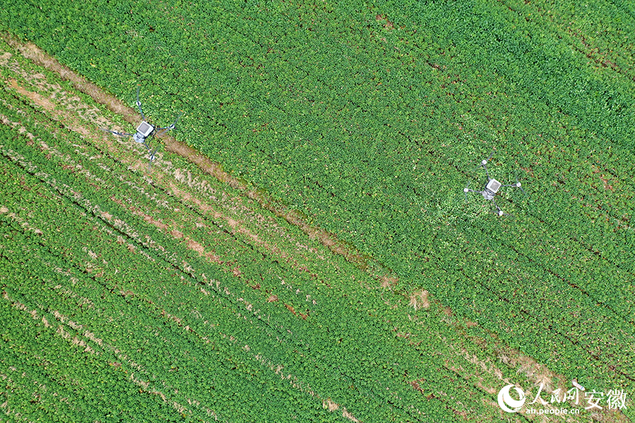 In the vast rapeseed fields in Zhanghu township, Wangjiang county, east China's Anhui Province, drones buzz through the skies like worker bees.