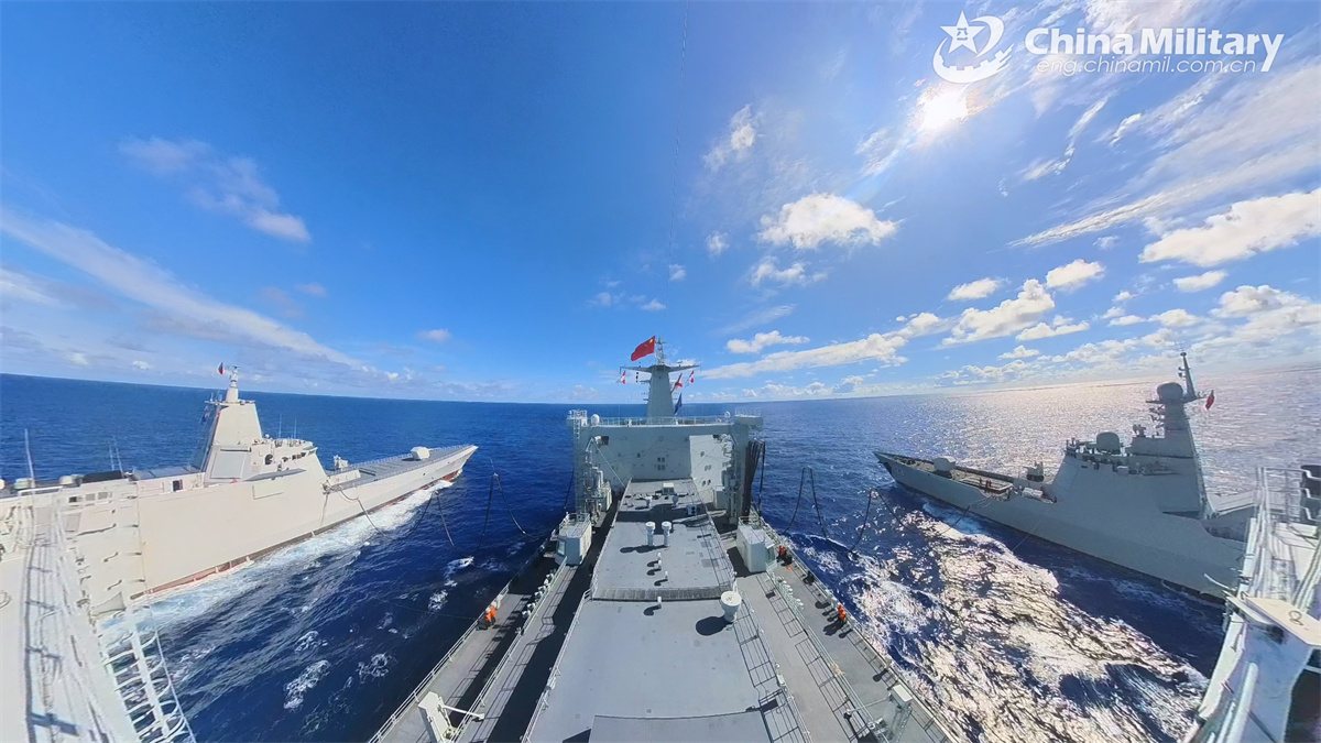 The comprehensive supply ship Hulunhu (Hull 901) is attached to a combat support ship flotilla with the navy under the Chinese PLA Northern Theater Command conducts replenishment-at-sea for the guided-missile destroyer Anshan (Hull 103) and Huainan (Hull 123) during a maritime training exercise in early February 2025. (eng.chinamil.com.cn/Photo by Zhou Yuanzhi)