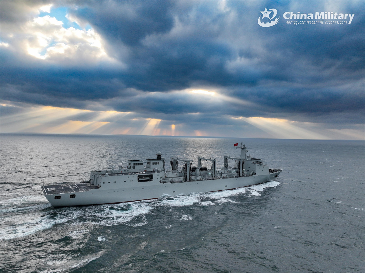 The comprehensive supply ship Hulunhu (Hull 901) is attached to a combat support ship flotilla with the navy under the Chinese PLA Northern Theater Command practices alongside replenishment-at-sea with the guided-missile destroyer Chengdu (Hull 120) during a maritime training exercise in early February 2025. (eng.chinamil.com.cn/Photo by Zhou Yuanzhi)
