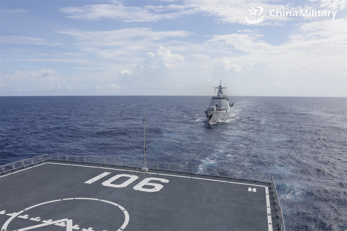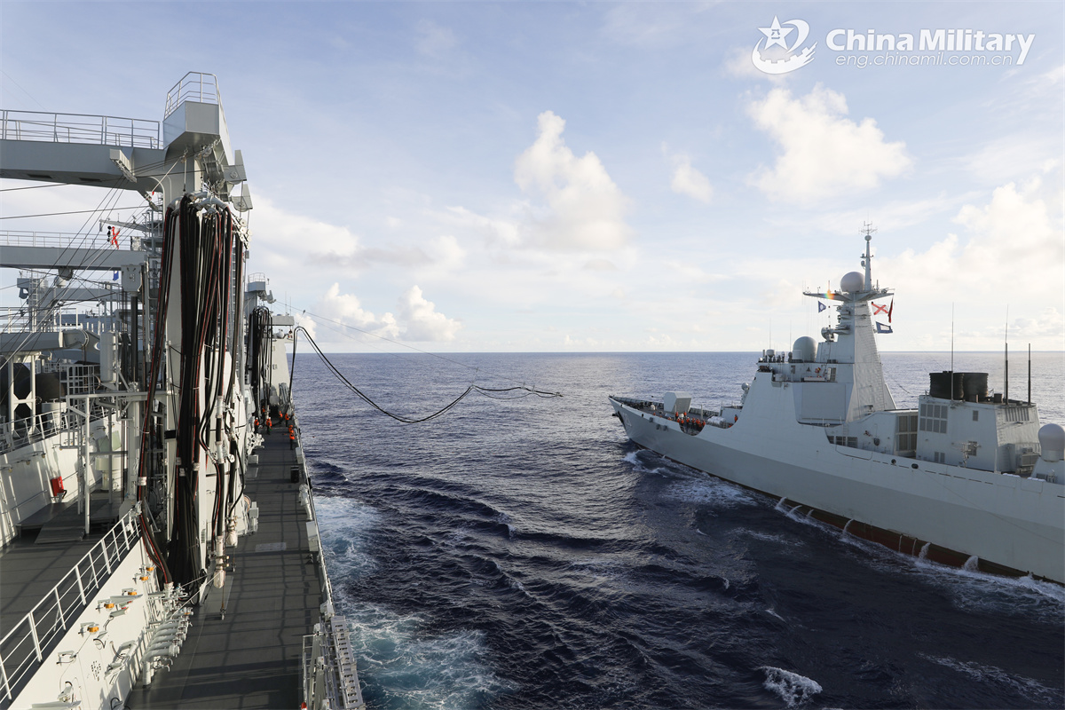 The comprehensive supply ship Hulunhu (Hull 901) is attached to a combat support ship flotilla with the navy under the Chinese PLA Northern Theater Command practices astern replenishment-at-sea with the guided-missile destroyer Huainan (Hull 123) during a maritime training exercise in early February 2025. (eng.chinamil.com.cn/Photo by Zhou Yuanzhi)