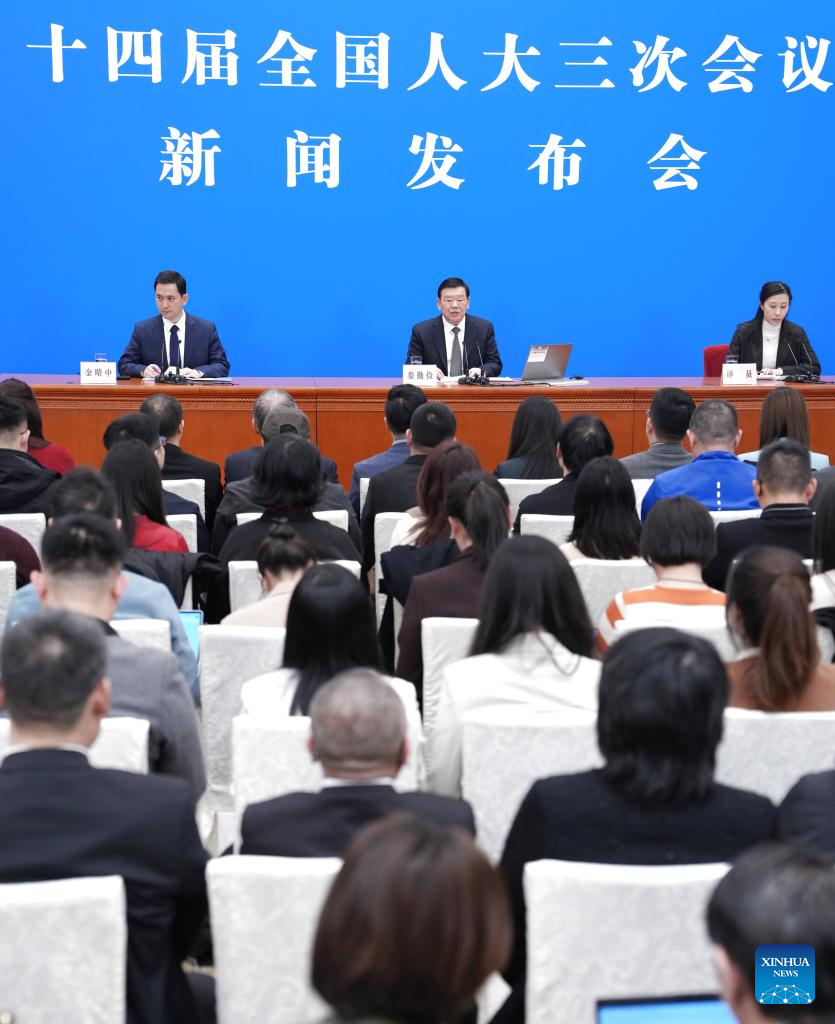 Lou Qinjian, spokesperson for the third session of the 14th National People's Congress (NPC), attends a press conference at the Great Hall of the People in Beijing, capital of China, March 4, 2025. The NPC, China's national legislature, held a press conference on Tuesday, one day ahead of the opening of its annual session. (Xinhua/Xu Bingjie)