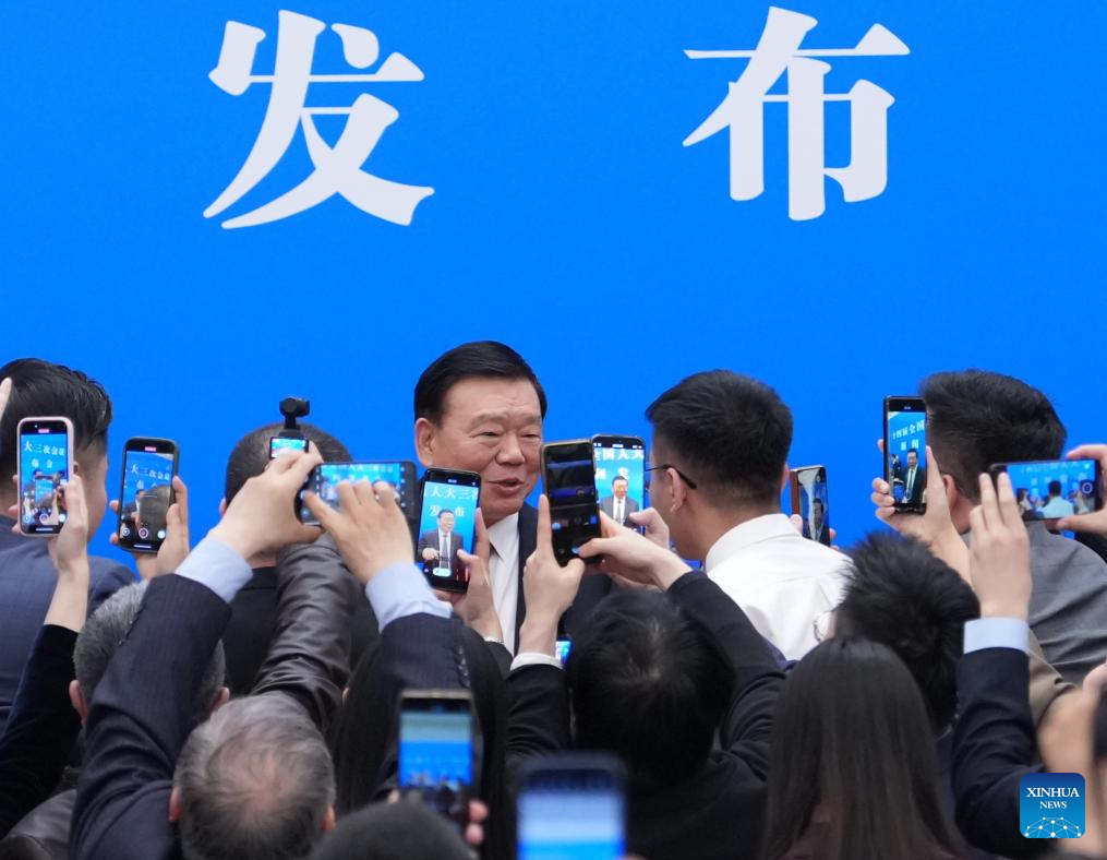 Lou Qinjian (C), spokesperson for the third session of the 14th National People's Congress (NPC), attends a press conference at the Great Hall of the People in Beijing, capital of China, March 4, 2025. The NPC, China's national legislature, held a press conference on Tuesday, one day ahead of the opening of its annual session. (Xinhua/Chen Yehua)
