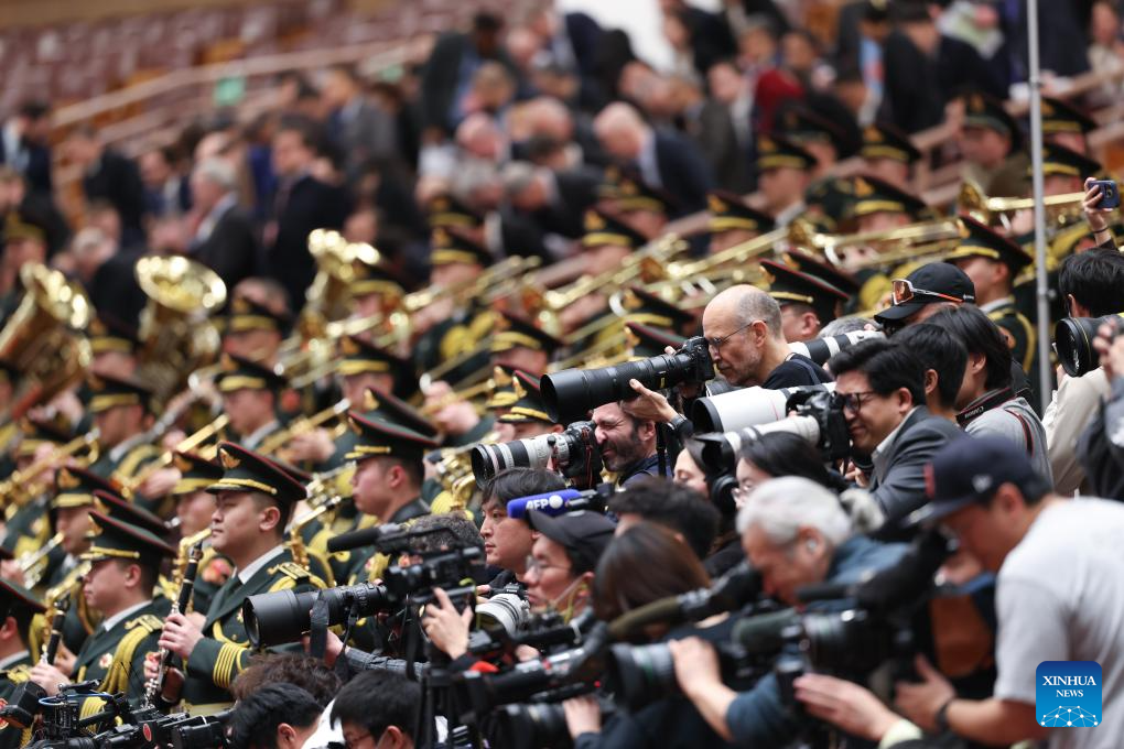 The military band of the Chinese People's Liberation Army performs at the opening meeting of the third session of the 14th National Committee of the Chinese People's Political Consultative Conference (CPPCC) at the Great Hall of the People in Beijing, capital of China, March 4, 2025. (Xinhua/Pang Xinglei)