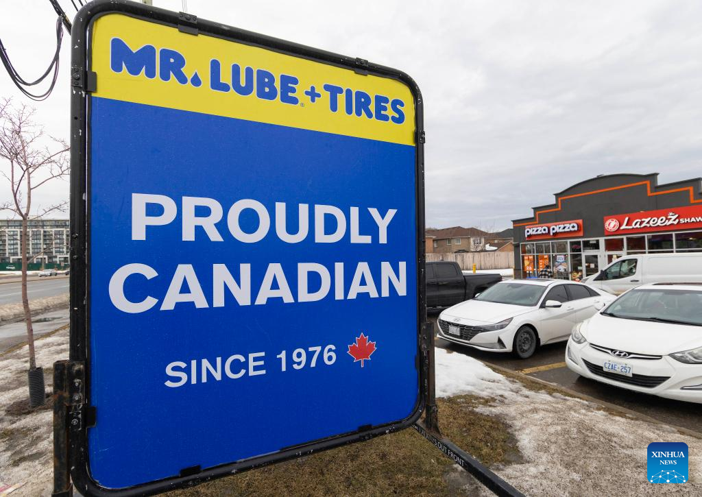 A board with the words "PROUDLY CANADIAN" is seen in a business plaza in Oakville, Ontario, Canada, on March 4, 2025. (Photo by Zou Zheng/Xinhua)