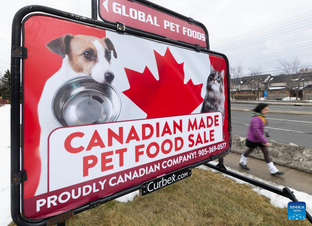 A woman walks past a board with the words "CANADIAN MADE PET FOOD SALE" by a street in Mississauga, Ontario, Canada, on March 4, 2025. (Photo by Zou Zheng/Xinhua)