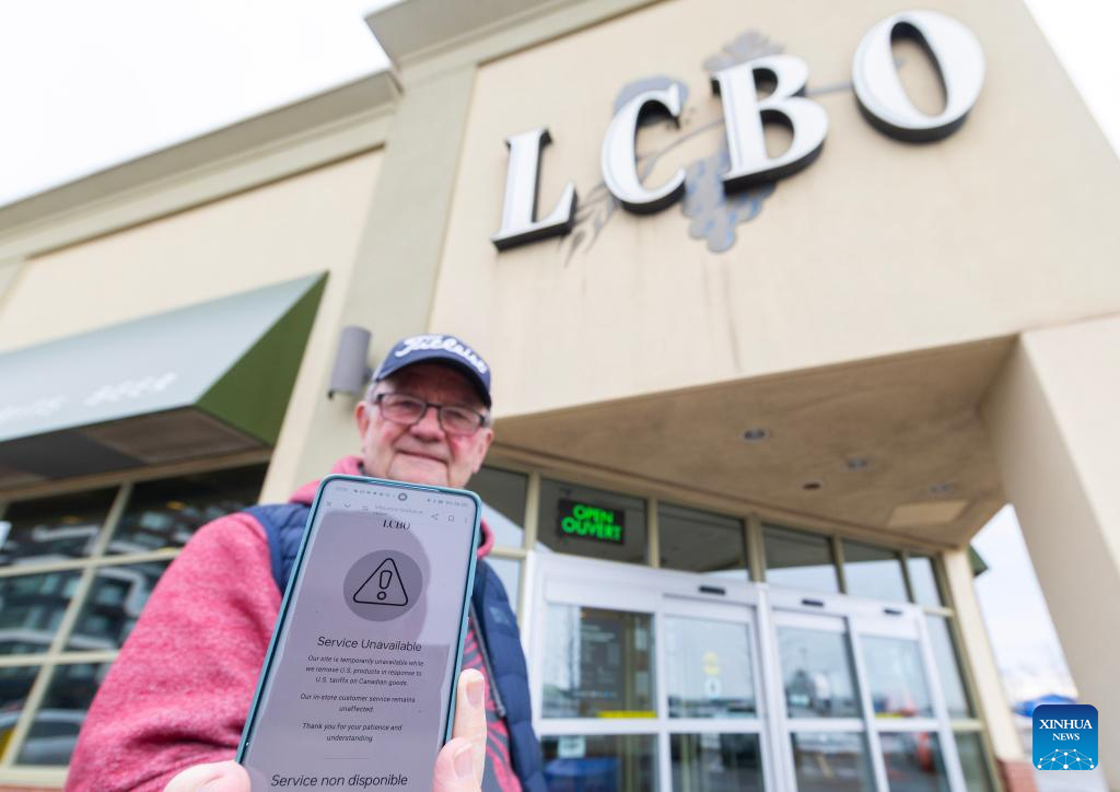 A man shows a mobile phone to display the Liquor Control Board of Ontario (LCBO)'s website temporarily unavailable while they remove U.S. products in response to U.S. tariffs on Canadian goods outside an LCBO store in Oakville, Ontario, Canada, on March 4, 2025. (Photo by Zou Zheng/Xinhua)