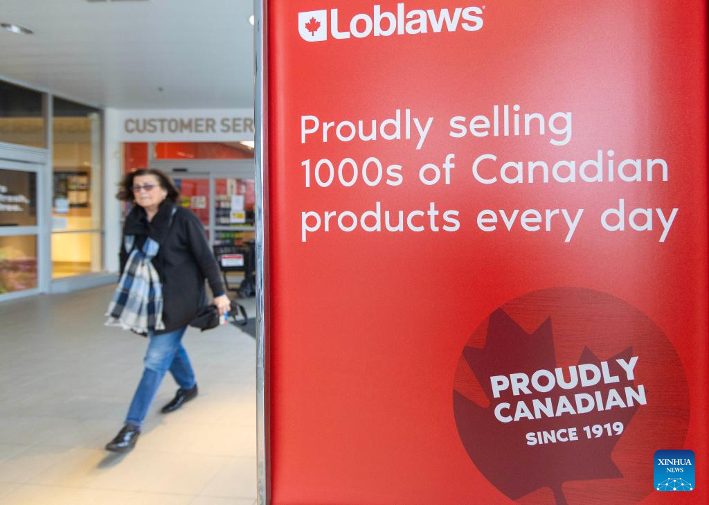 A woman walks past a poster with the words "PROUDLY CANADIAN" at a supermarket in Toronto, Ontario, Canada, on March 4, 2025. (Photo by Zou Zheng/Xinhua)