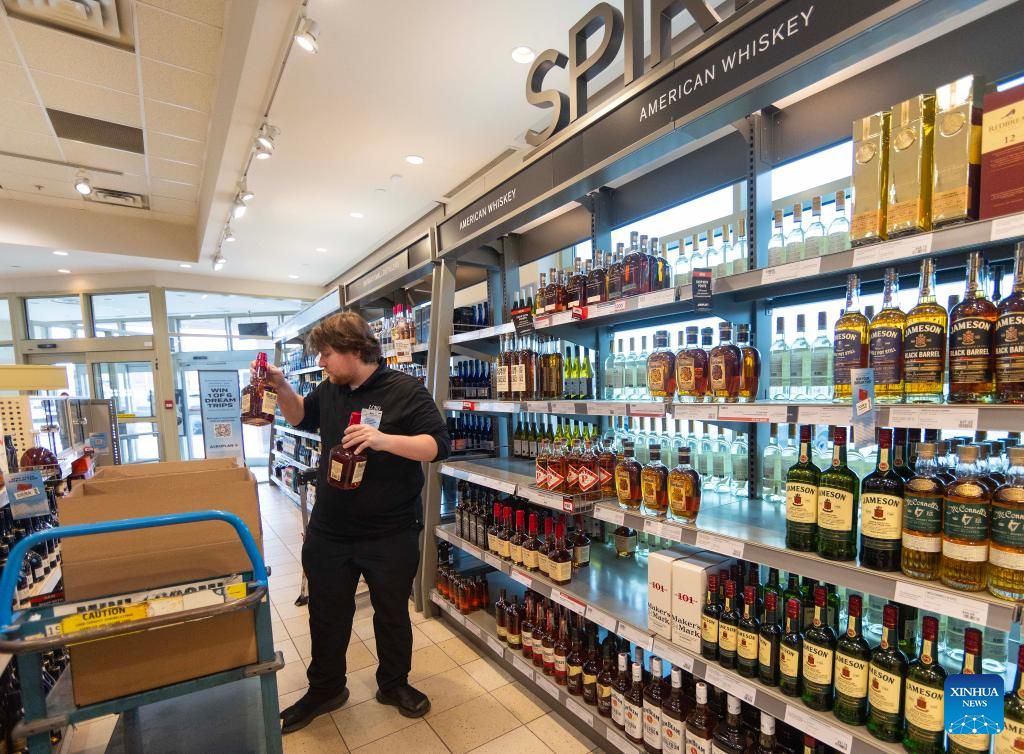 An employee removes U.S. alcohol products from a shelf at a Liquor Control Board of Ontario store in Oakville, Ontario, Canada, on March 4, 2025. (Photo by Zou Zheng/Xinhua)