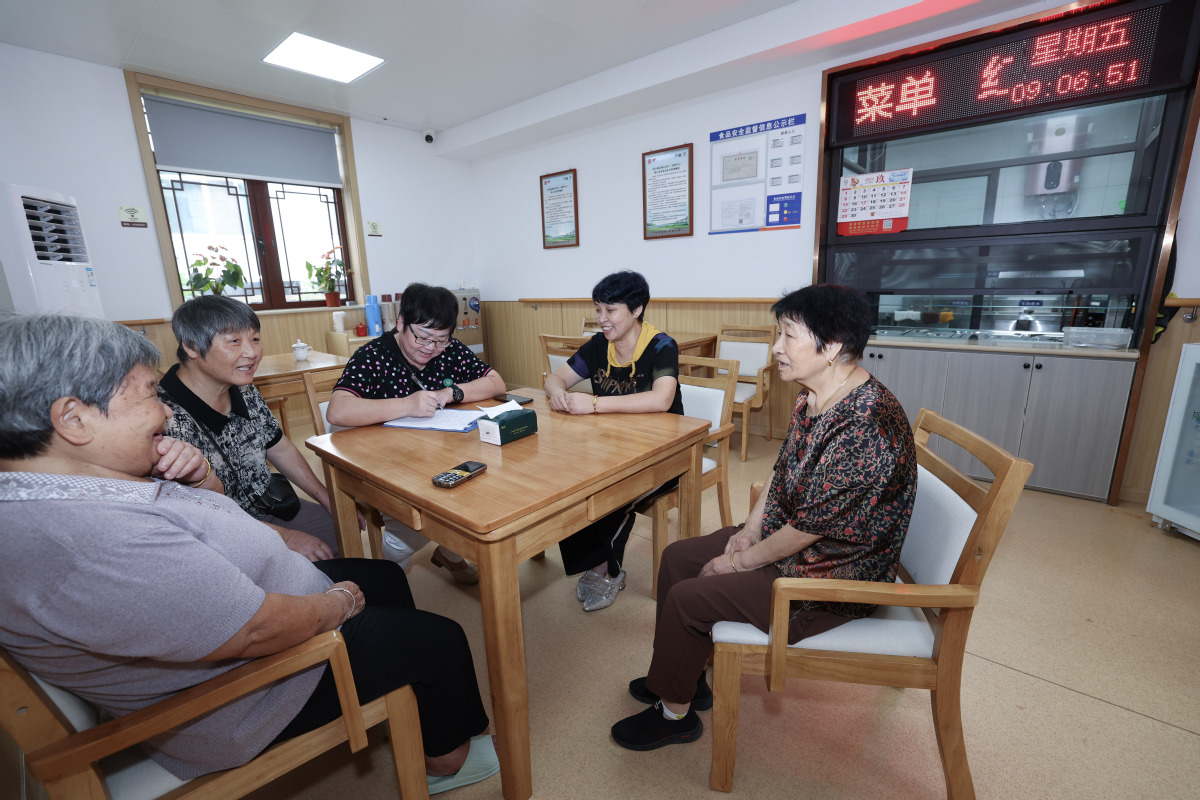 Zhou and Xu collect senior residents' opinions on the operation of a local activity center for seniors during their field research. (Xu Yu/Xinhua)