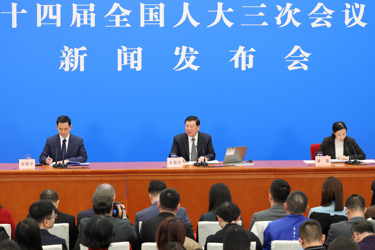 Lou Qinjian, spokesman for the third session of the 14th National People's Congress, attends a news conference at the Great Hall of the People in Beijing, March 4, 2025. (Photo by Wang Zhuangfei/chinadaily.com.cn)